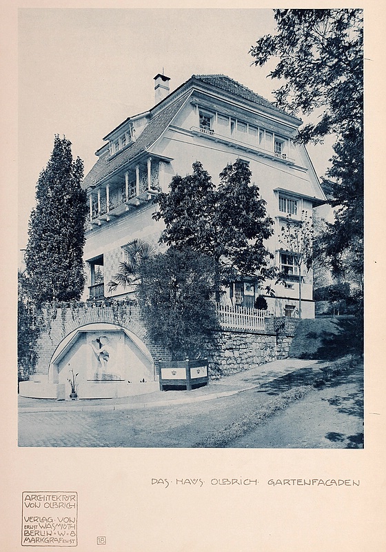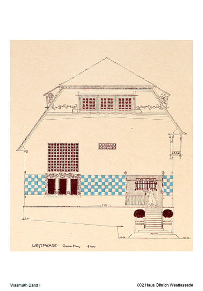Das historische Olbrich-Haus ziert, wie auf alten Fotos zu erkennen ist, ein Fliesen-Spiegel, der um das gesamte Haus bis in die Fenster- und Türöffnungen gezogen war. Einen Eindruck vermitteln die hier hinterlegten Bilder.
