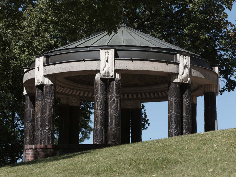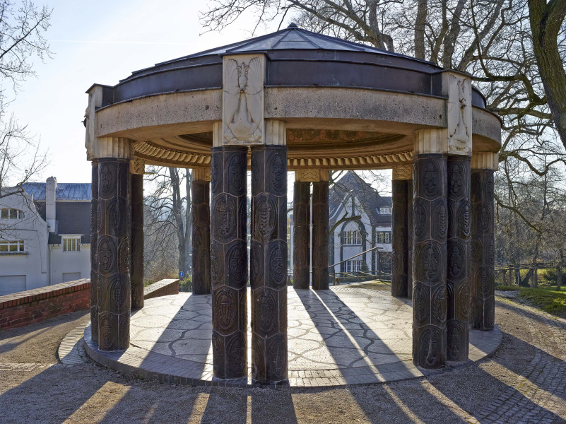 Die Besonderheit dieses in der Form eines antiken Monopteros gestalteten Gartenpavillons sind die acht mit keramischen Platten verkleideten Doppelsäulen, die eine im Inneren ornamental bemalte Kuppel tragen. Eine konstruktive Verklammerung zwischen Säulen und Dach erfolgt über acht keramische Schwanenreliefs, die gleichzeitig Wasserspeier für die Dachentwässerung sind. Die Keramiken wurden 1914 von der "Gail´sche Dampfziegelei und Tonwarenfabrik, Gießen" hergestellt.